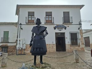 Saliendo del Museo Cervantino se encuentra la Iglesia Parroquial la cual Don Quijote reconoció que era la iglesia principal de El Toboso. Y junto a la iglesia está la Plaza Juan Carlos I donde en ese momento había una carrera y muchas personas corrían o los espectadores aplaudían. En el otro lado de la plaza estaban las esculturas de Dulcinea y de Don Quijote. Don Quijote andaba buscando el palacio de la princesa doña Dulcinea. Cerca de aquí está la Casa-Museo de Dulcinea pero estaba cerrada y no pudimos entrar. El Toboso es un pueblo muy bonito para pasear ya que hay una ruta literaria en donde uno encuentra las frases dichas por Don Quijote y por Sancho grabadas en los edificios a lo largo del camino. También hay una ruta de los pozos y unas bodegas de vino donde dan servicios de cata. Las puertas de las casas eran preciosas también.